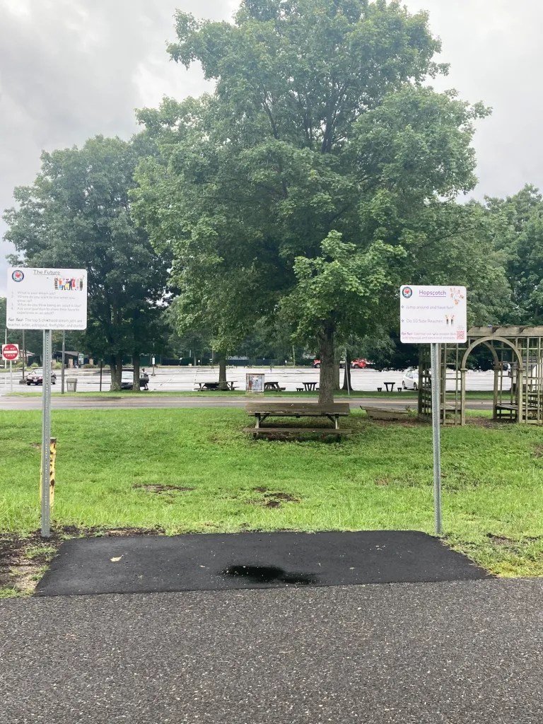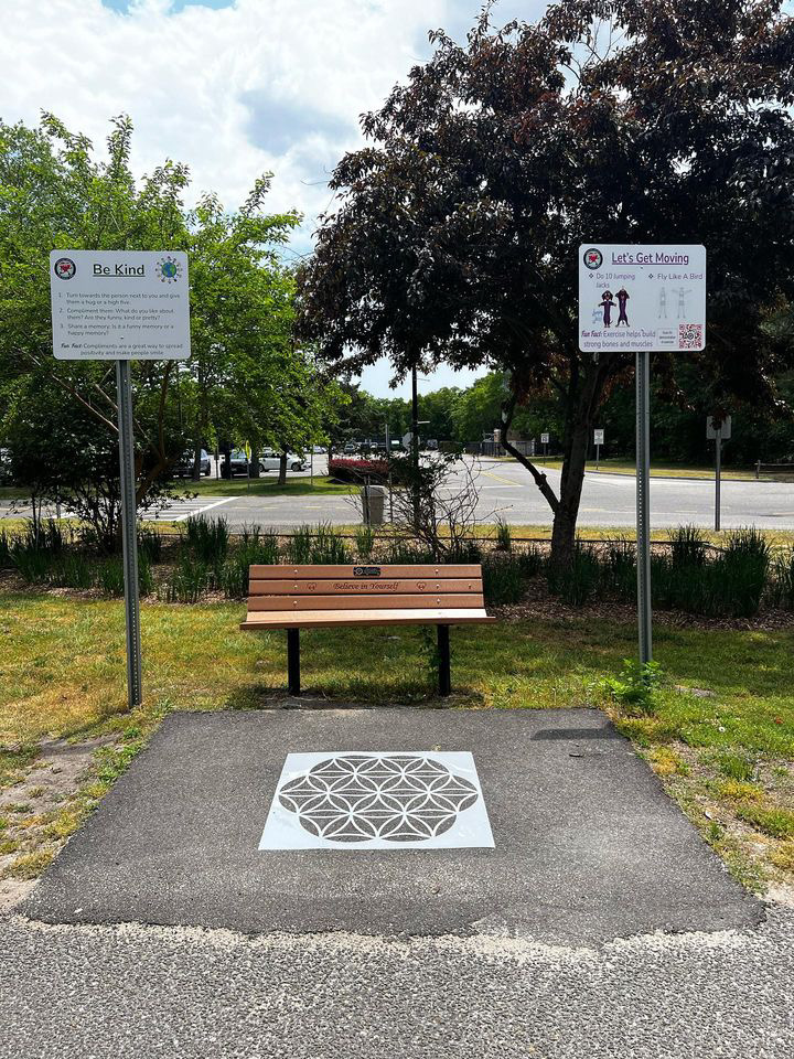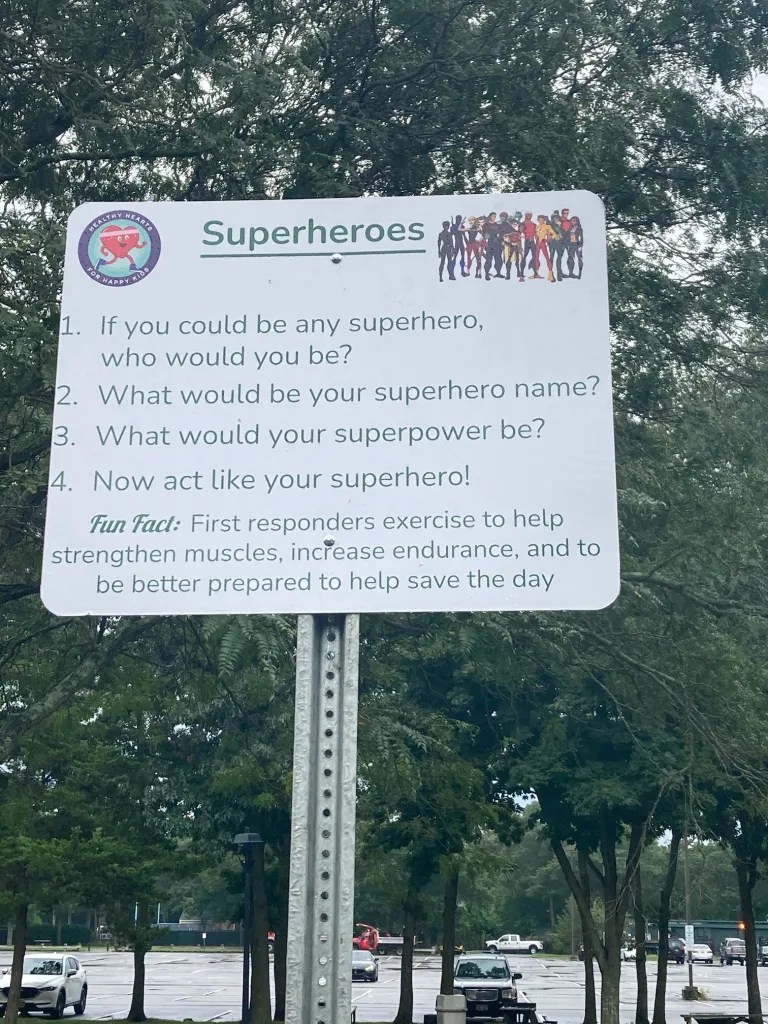 The track consists of eight stations with two signs at each stop incorporating different activities like stretching, hopscotch and running in place combined with positive and inspirational themes such as, “Be Kind,” “Let Your Imagination Fly,” and “Superheroes.”
